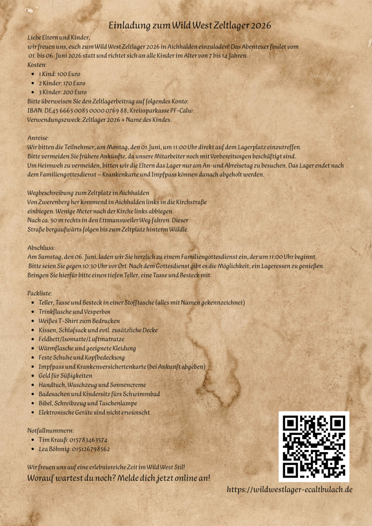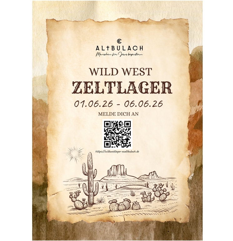 Jungschar-Zeltlager vom 1. bis 6. Juni 2026 Jetzt online anmelden:https://wildwestlager-ecaltbulach.de/ Hier kannst du den Flyer herunterladen